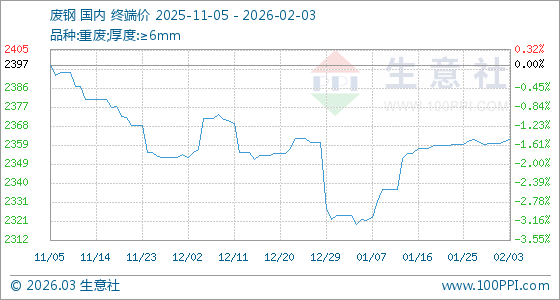 2月3日,生意社廢鋼基準(zhǔn)價(jià)為2360.67元/噸,與本月初(2359.58元/噸)相比,上漲了0.05%。