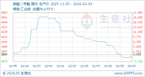 2月3日,生意社碳酸二甲酯基準(zhǔn)價(jià)為3766.67元/噸,與本月初(3750.00元/噸)相比,上漲了0.44%。