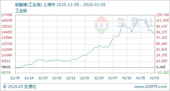 2月3日,生意社碳酸鋰(工業(yè)級(jí))基準(zhǔn)價(jià)為143000.00元/噸,與本月初(148000.00元/噸)相比,下降了3.38%。