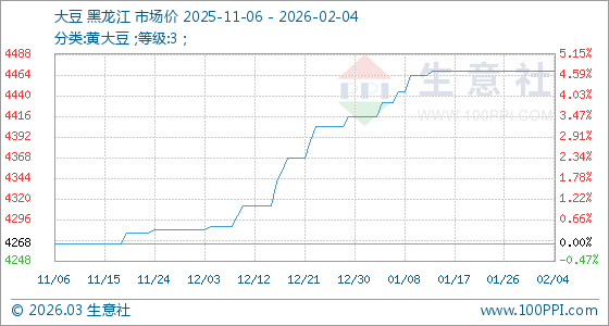 2月4日,生意社大豆基準(zhǔn)價(jià)為4468.00元/噸,與本月初持平。
