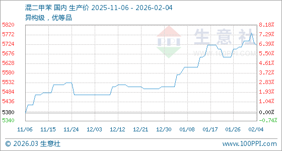 2月4日,生意社混二甲苯基準(zhǔn)價(jià)為5730.00元/噸,與本月初(5740.00元/噸)相比,下降了0.17%。