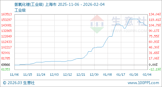 2月4日,生意社氫氧化鋰(工業(yè)級)基準(zhǔn)價為143000.00元/噸,與本月初(148000.00元/噸)相比,下降了3.38%。