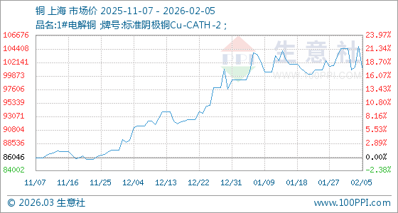 2月5日,生意社銅基準(zhǔn)價(jià)為104786.67元/噸,與本月初(104496.67元/噸)相比,上漲了0.28%。