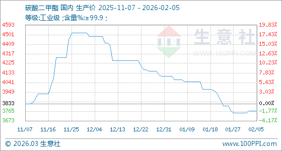2月5日,生意社碳酸二甲酯基準(zhǔn)價(jià)為3766.67元/噸,與本月初(3750.00元/噸)相比,上漲了0.44%。