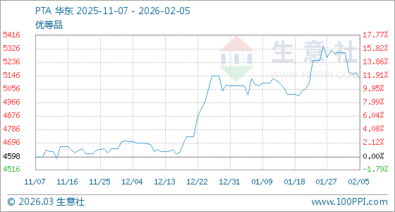 2月5日,生意社PTA基準(zhǔn)價為5167.03元/噸,與本月初(5298.83元/噸)相比,下降了2.49%。