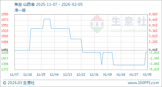 2月5日,生意社焦炭基準(zhǔn)價(jià)為1443.75元/噸,與本月初(1391.25元/噸)相比,上漲了3.77%。