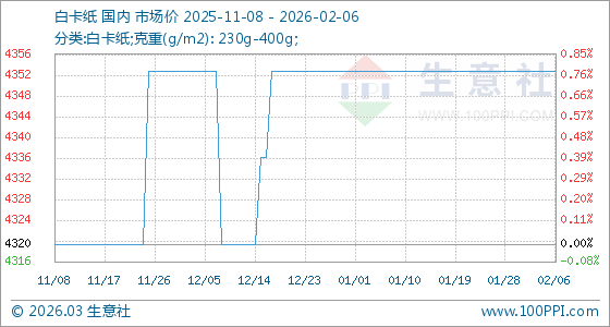 2月6日,生意社白卡紙基準價為4353.33元/噸,與本月初持平。