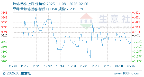 2月6日,生意社熱軋板卷基準(zhǔn)價為3310.00元/噸,與本月初(3323.33元/噸)相比,下降了0.4%。