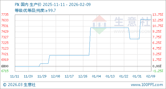 2月9日,生意社PX基準(zhǔn)價(jià)為7650.00元/噸,與本月初(7300.00元/噸)相比,上漲了4.79%。