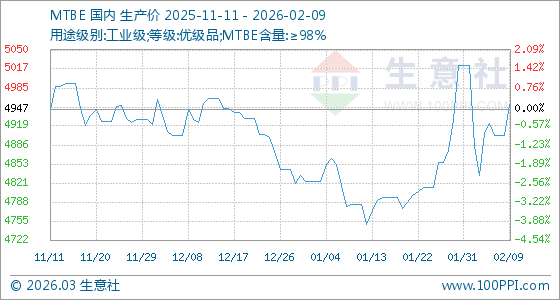 2月9日,生意社MTBE基準(zhǔn)價(jià)為4903.33元/噸,與本月初(5023.33元/噸)相比,下降了2.39%。