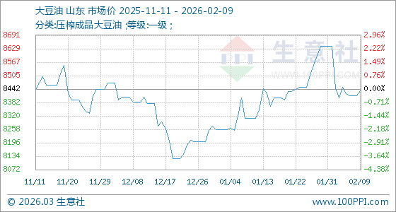 2月9日,生意社大豆油基準價為8412.00元/噸,與本月初(8640.00元/噸)相比,下降了2.64%。