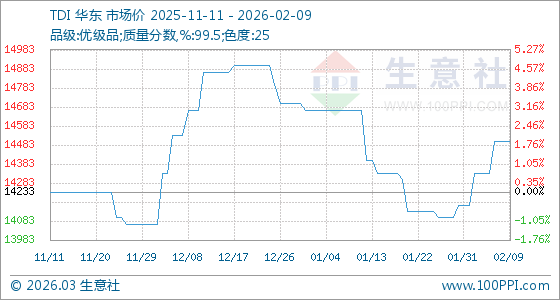 2月9日,生意社TDI基準(zhǔn)價為14500.00元/噸,與本月初(14166.67元/噸)相比,上漲了2.35%。