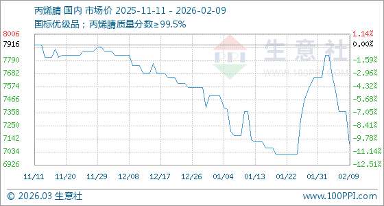 2月9日,生意社丙烯腈基準(zhǔn)價(jià)為7366.67元/噸,與本月初(7650.00元/噸)相比,下降了3.7%。