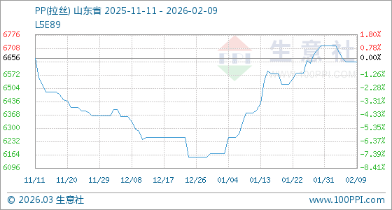 2月9日,生意社PP(拉絲)基準(zhǔn)價(jià)為6640.00元/噸,與本月初(6720.00元/噸)相比,下降了1.19%。