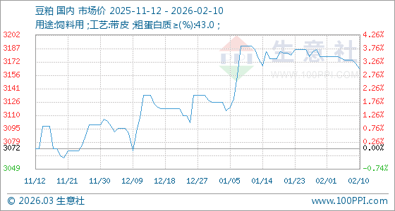 2月10日,生意社豆粕基準價為3170.00元/噸,與本月初(3178.00元/噸)相比,下降了0.25%。