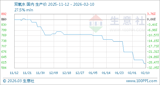 2月10日,生意社雙氧水基準(zhǔn)價為610.00元/噸,與本月初(676.67元/噸)相比,下降了9.85%。