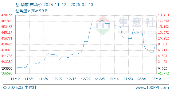 2月10日,生意社鈷基準價為426000.00元/噸,與本月初(444800.00元/噸)相比,下降了4.23%。