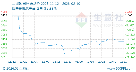 2月10日,生意社二甘醇基準(zhǔn)價(jià)為3413.33元/噸,與本月初(3475.00元/噸)相比,下降了1.77%。