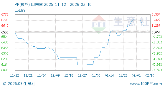 2月10日,生意社PP(拉絲)基準價為6640.00元/噸,與本月初(6720.00元/噸)相比,下降了1.19%。