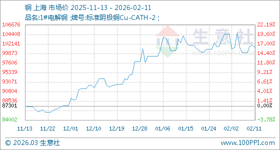 2月11日,生意社銅基準價為101858.33元/噸,與本月初(104496.67元/噸)相比,下降了2.52%。