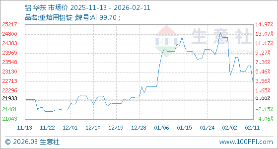 2月11日,生意社鋁基準(zhǔn)價(jià)為23406.67元/噸,與本月初(24666.67元/噸)相比,下降了5.11%。