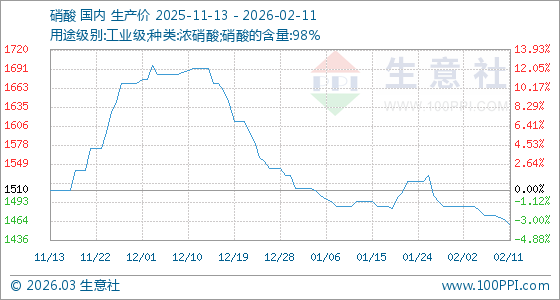 2月11日,生意社硝酸基準(zhǔn)價(jià)為1466.67元/噸,與本月初(1486.67元/噸)相比,下降了1.35%。