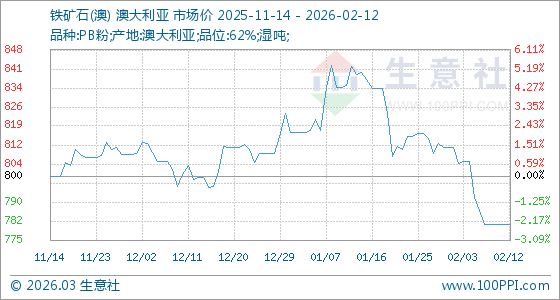 2月12日,生意社鐵礦石(澳)基準(zhǔn)價為781.44元/噸,與本月初(811.00元/噸)相比,下降了3.64%。