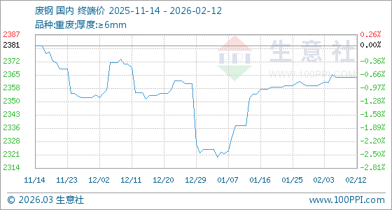 2月12日,生意社廢鋼基準(zhǔn)價(jià)為2363.92元/噸,與本月初(2359.58元/噸)相比,上漲了0.18%。