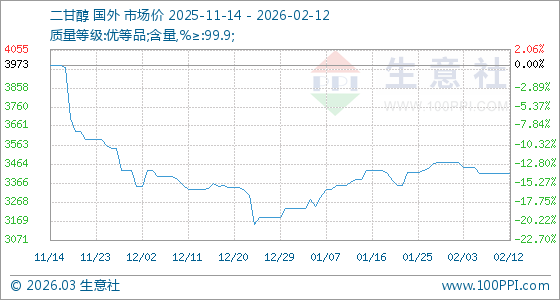 2月12日,生意社二甘醇基準(zhǔn)價(jià)為3413.33元/噸,與本月初(3475.00元/噸)相比,下降了1.77%。