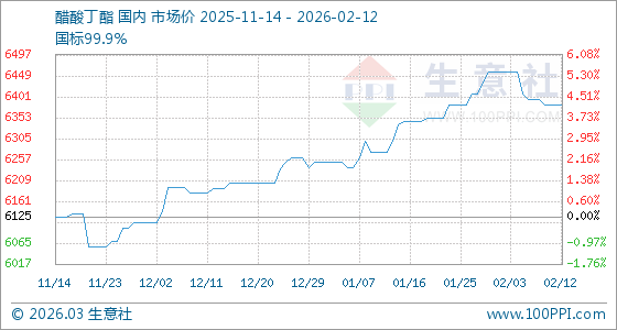 2月12日,生意社醋酸丁酯基準(zhǔn)價為6382.50元/噸,與本月初(6457.50元/噸)相比,下降了1.16%。