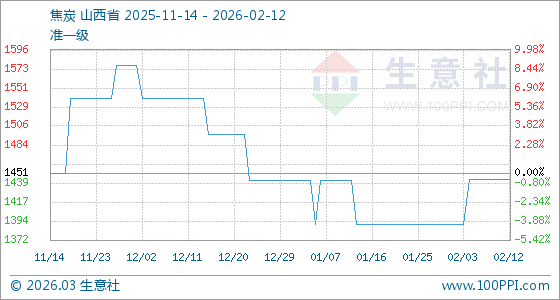 2月12日,生意社焦炭基準(zhǔn)價(jià)為1443.75元/噸,與本月初(1391.25元/噸)相比,上漲了3.77%。
