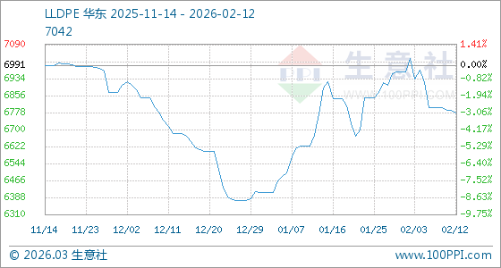 2月12日,生意社LLDPE基準(zhǔn)價為6790.00元/噸,與本月初(6966.67元/噸)相比,下降了2.54%。
