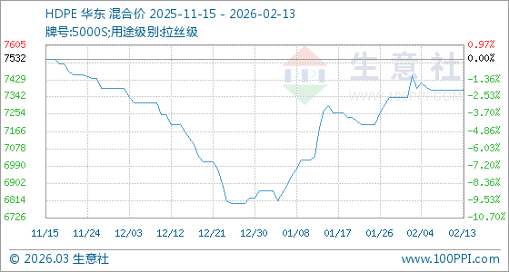 2月13日,生意社HDPE基準價為7375.00元/噸,與本月初(7337.50元/噸)相比,上漲了0.51%。