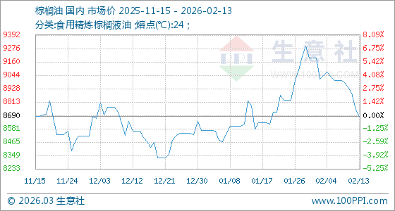 2月13日,生意社棕櫚油基準價為8740.00元/噸,與本月初(9196.00元/噸)相比,下降了4.96%。