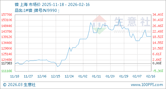 2月16日,生意社鎳基準(zhǔn)價(jià)為140100.00元/噸,與本月初(146016.67元/噸)相比,下降了4.05%。