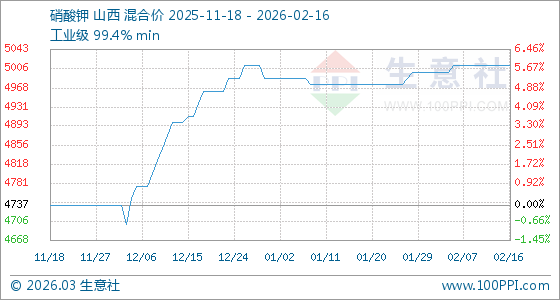 2月16日,生意社硝酸鉀基準(zhǔn)價(jià)為5012.50元/噸,與本月初(5000.00元/噸)相比,上漲了0.25%。