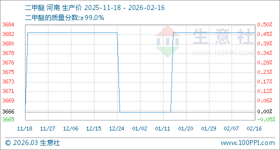 2月16日,生意社二甲醚基準(zhǔn)價(jià)為3683.33元/噸,與本月初持平。