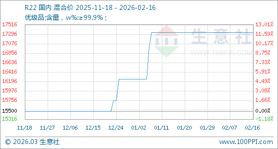 2月16日,生意社R22基準(zhǔn)價(jià)為17333.33元/噸,與本月初持平。