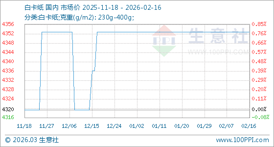 2月16日,生意社白卡紙基準(zhǔn)價(jià)為4353.33元/噸,與本月初持平。