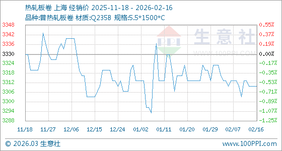 2月16日,生意社熱軋板卷基準(zhǔn)價(jià)為3310.00元/噸,與本月初(3323.33元/噸)相比,下降了0.4%。
