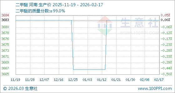 2月17日,生意社二甲醚基準(zhǔn)價(jià)為3683.33元/噸,與本月初持平。