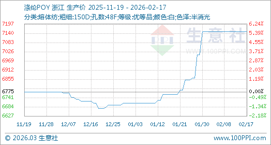 2月17日,生意社滌綸POY基準價為7150.00元/噸,與本月初持平。