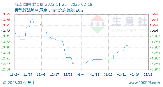 2月18日,生意社玻璃基準(zhǔn)價(jià)為13.25元/平方米,與本月初(13.10元/平方米)相比,上漲了1.15%。