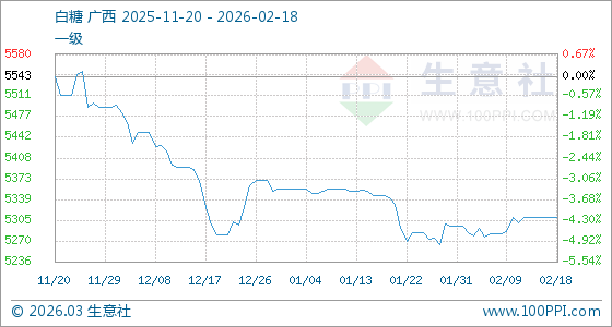 2月18日,生意社白糖基準價為5310.00元/噸,與本月初(5295.00元/噸)相比,上漲了0.28%。