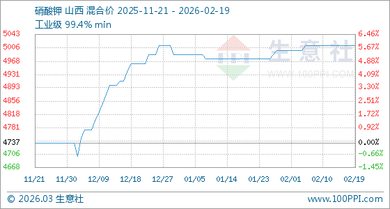 2月19日,生意社硝酸鉀基準(zhǔn)價為5012.50元/噸,與本月初(5000.00元/噸)相比,上漲了0.25%。