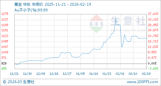 2月19日,生意社黃金基準(zhǔn)價(jià)為1107.47元/克,與本月初(1199.84元/克)相比,下降了7.7%。