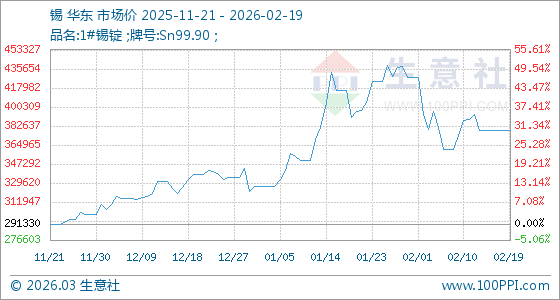 2月19日,生意社錫基準價為378420.00元/噸,與本月初(427370.00元/噸)相比,下降了11.45%。