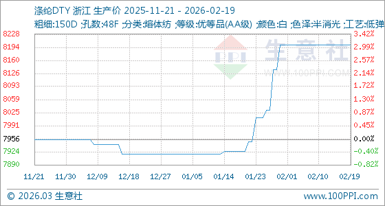 2月19日,生意社滌綸DTY基準(zhǔn)價為8200.00元/噸,與本月初持平。