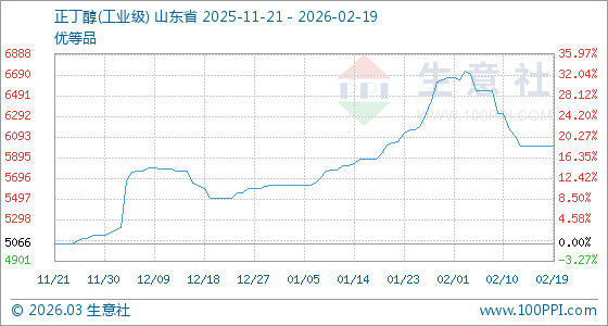 2月19日,生意社正丁醇(工業(yè)級)基準價為6000.00元/噸,與本月初(6663.33元/噸)相比,下降了9.95%。