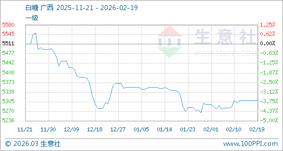 2月19日,生意社白糖基準(zhǔn)價(jià)為5310.00元/噸,與本月初(5295.00元/噸)相比,上漲了0.28%。